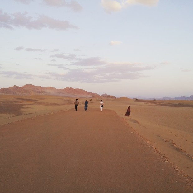Aber die Weite der Wüste beruhigt mich. Ich starre aus dem Fenster statt auf die Frau im Tschador vor mir. Ich versuche die Tatsache zu belächeln, dass weder sie noch ich in der ersten Reihe dieses Busses sitzen dürfen, da der Busfahrer von uns als Frauen abgelenkt sein könnte. Als Michi mir vorhin einen Witz vorlas lachten wir herzhaft. Laut. Unsere kleine Rebellion in der vorletzten Rehe des Busses, ungesehen vom Busfahrer,  gegen die Norm, sich als Frau unauffällig zu verhalten.